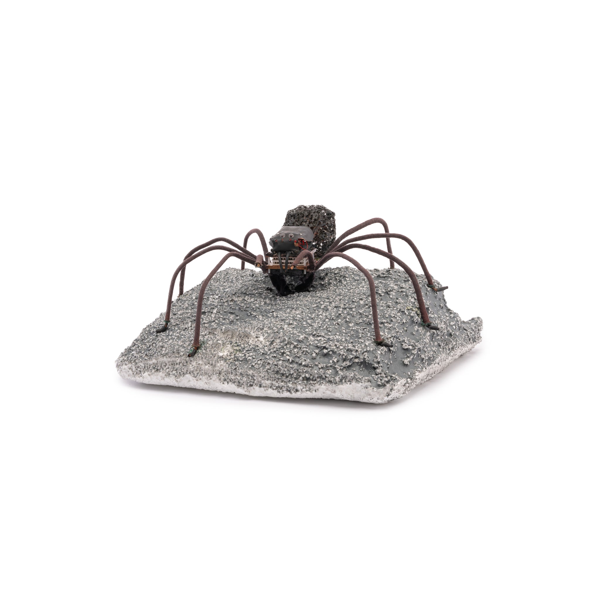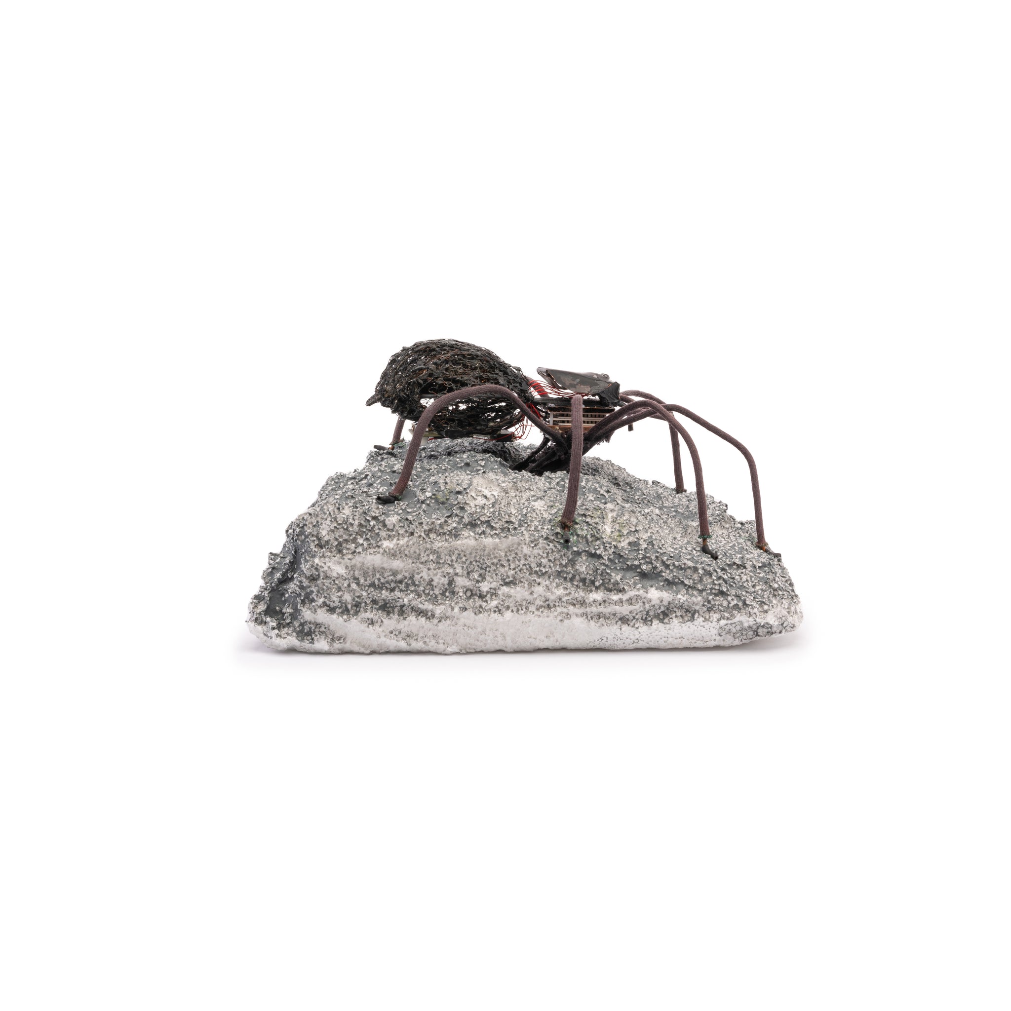 Friendly 8-legged Tarantula spider with blinking red eyes. Powered by water as are all Evap-o-watts, but disguised by hiding the water bowl under a shaped painted foam stone. His legs are the evaporators and body is the room temperature collector. All in black of course. Foam stone is 12" by12".